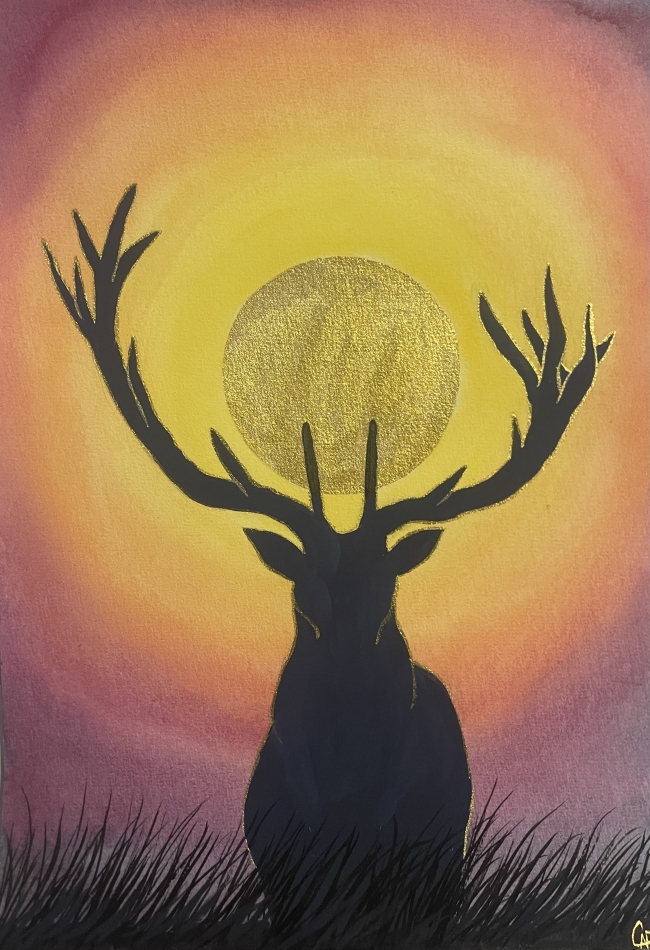 Aquarelle avec peinture doré pour le soleil, format 21/29cm